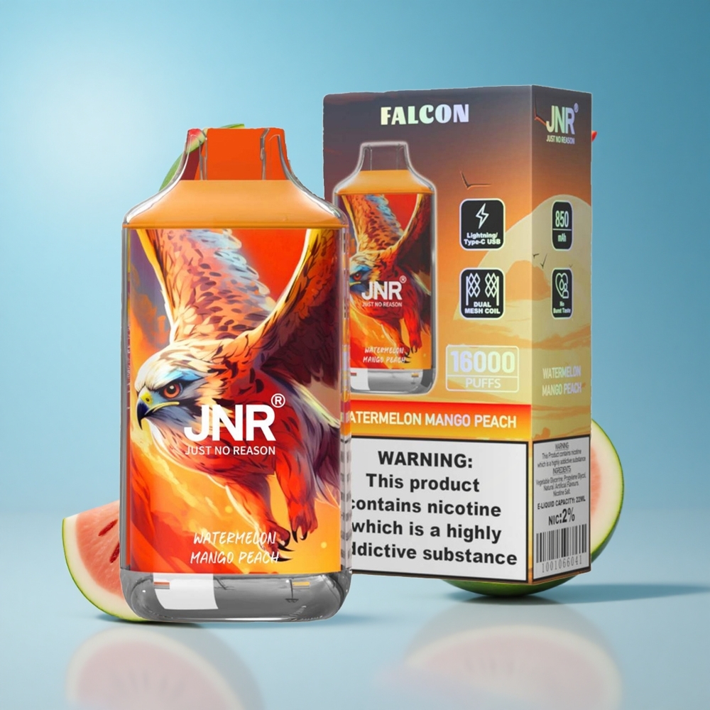 JNR Falcon 16000 Puffs بطارية 850 ملي أمبير وعصير 22 مل بنكهة البطيخ والمانجو والخوخ