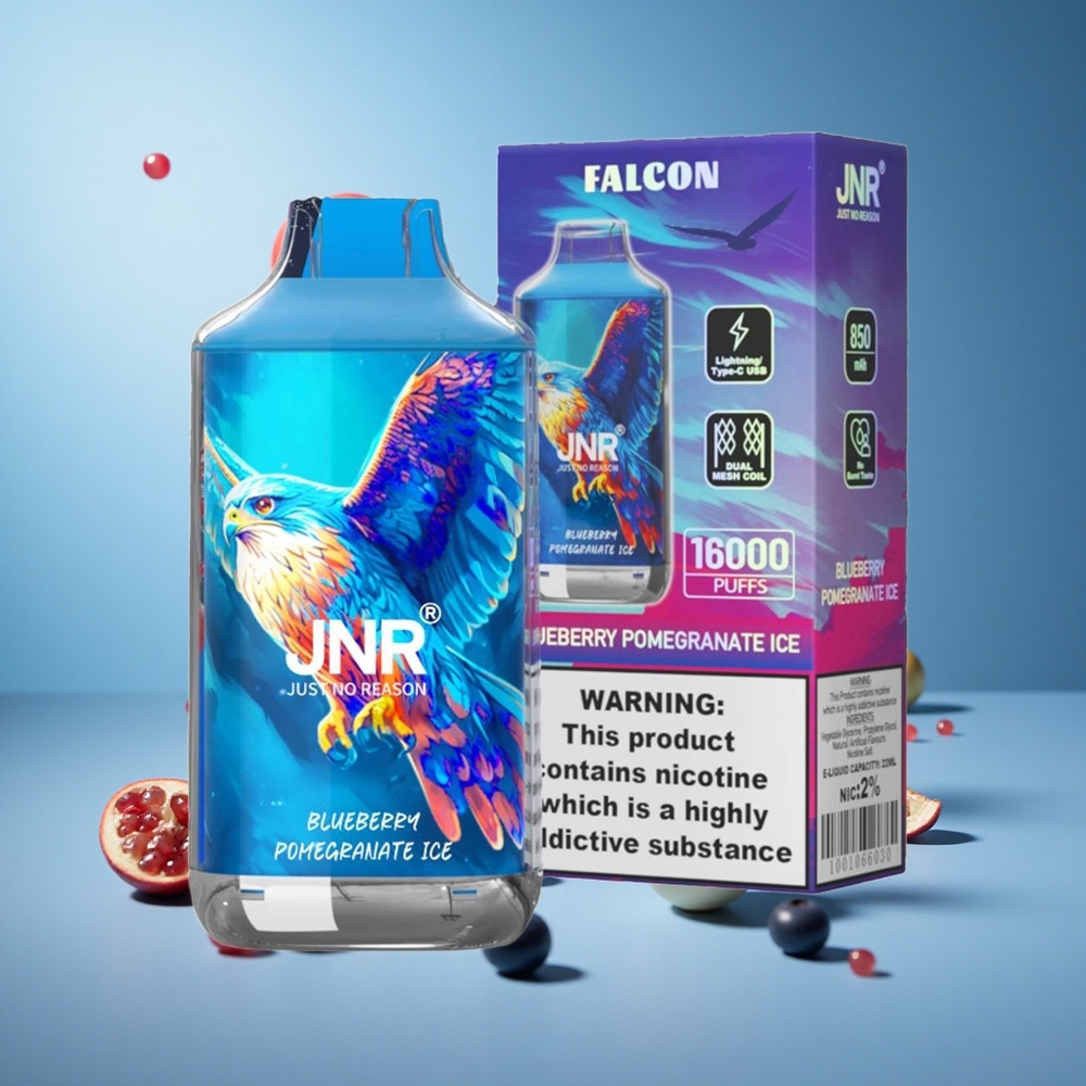 JNR Falcon 16000 Puffs توت أزرق ورمان جليد مع شاشة LED ذكية وسعة بطارية 850 مللي أمبير